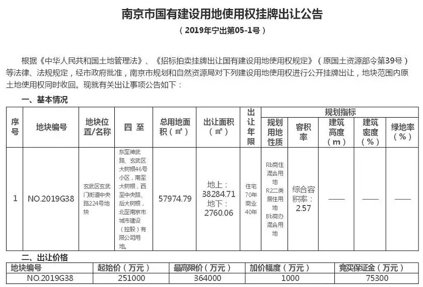 NO.2019G38(玄武区玄武门街道中央路224号地块)地位于城中板块,地块起拍价25.1亿,最高限价36.4亿,起拍楼面价23795元/㎡,最高楼面价34507元/㎡。