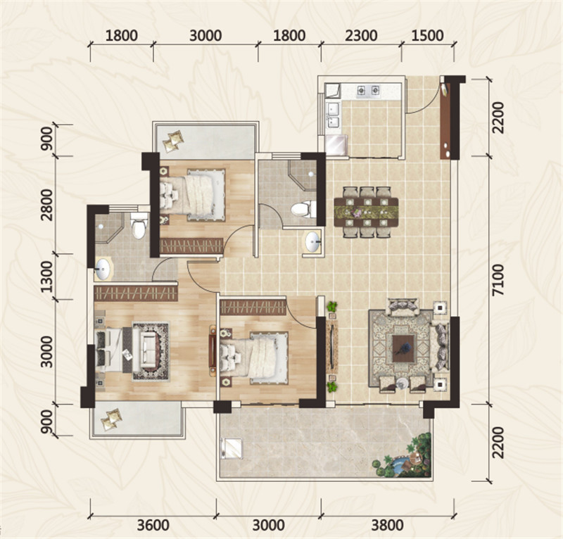 按照现在的家庭构成,三房刚好符合家庭居住需要:父母一间、孩子一间、老人一间。如果不需要老人来带孩子,父母一间、孩子一间,还有一间作为书房或者休闲房间,也是刚需范围。凤翔·容州文化中心98㎡的户型,全功能通透三房,户型实用,舒适大气。客厅、双卧南向,阳光无处不在。尤其是主卧空间开阔,还配备独立卫生间,盛放无尽生活甜蜜。 其中,一间次卧带有飘窗阳台,另一间次卧与景观阳台相连,尺度非常阔绰,把花朵和美景引入家中!最让人惊喜的是,该户型将近7米超宽阳台设计,一年四季,公园美景,鸟语花香,尽收眼底。