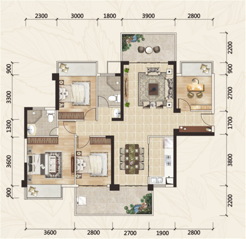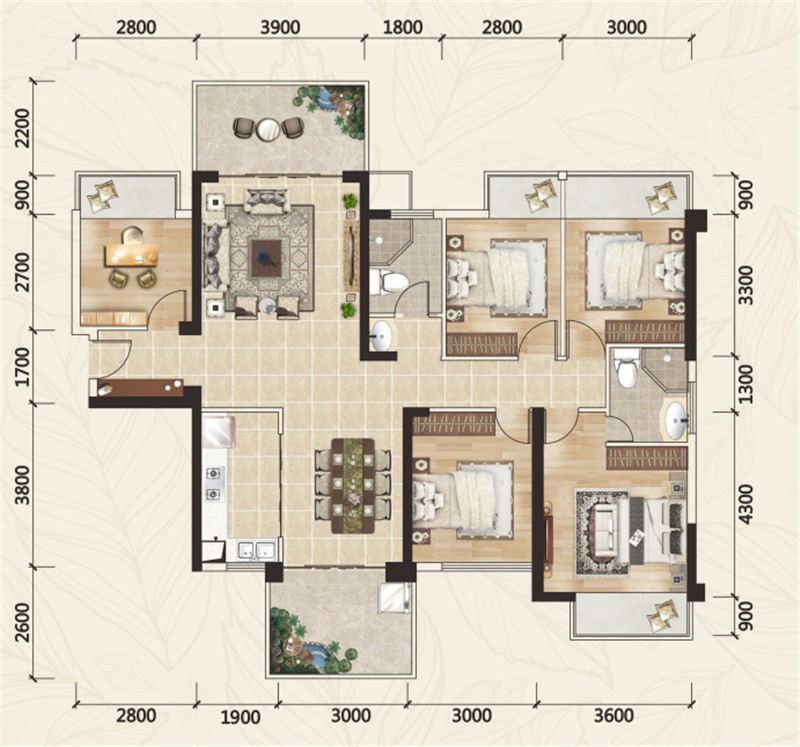 F户型鉴赏:建面约123㎡,4房2厅2卫2阳台
