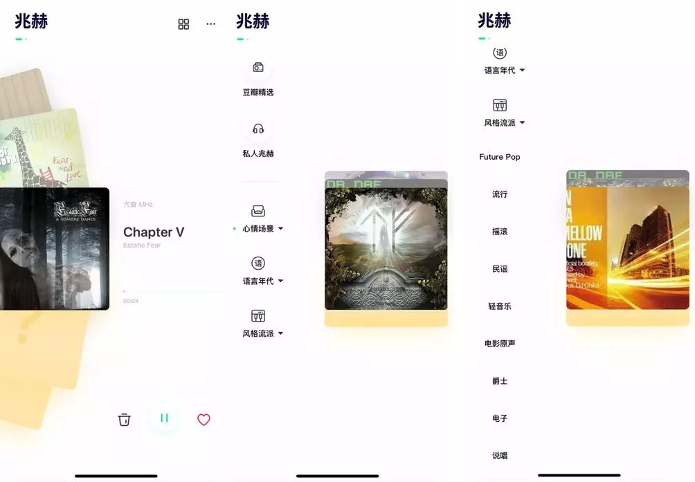 另外,考虑到当下用户体验已经进入到了竖屏时代,豆瓣FM播放器兆赫下的歌曲切换方式使用也调整为了上下,而不是左右。在界面的上方滑动,可以切换不同的板块,在兆赫板块的中间滑动,即会出现包括豆瓣精选、私人兆赫、心情、年代、风格等用户熟悉的兆赫。
