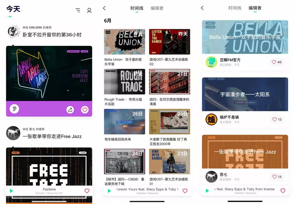 新增的歌单功能,也体现了豆瓣FM的差异化推荐。该模块每日由编辑团队精选、更新四组不同风格的歌单。据官方介绍,算法的作用是收束象限,而编辑的作用是在相对的范围内来把握风格调性及审美高度。