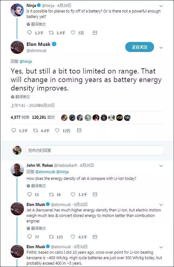 当有粉丝对电动力驱动飞机的重量产生怀疑后,马斯克在社交媒体中进一步解释说,虽然传统的Jet A航空煤油能量密度要比电池更高,但电池的优势在于,电池要比煤油更轻,转化能量的效率也更高。不过,要打造电动飞机,目前技术条件下的电池能量密度还需要进一步提高。