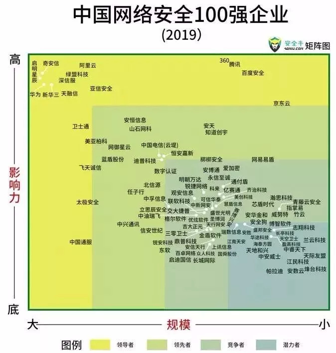 在安全牛发布的《中国网络安全100强企业 (2019)》报告中,中国网络安全领域的企业百强划分为四大区域,分别为:领导者、领先者、竞争者和潜力者矩阵,少数企业占头部,如启明星辰、奇安信(原360企业安全)、华为、阿里云、新华三、腾讯、360、百度等。