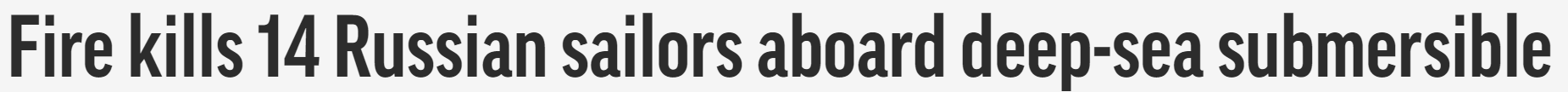 【火灾导致14名俄罗斯深海潜艇船员死亡】俄罗斯国防部周二称,俄罗斯海军的一艘深海研究潜水艇发生火灾,燃烧产生的有毒气体导致14名船员死亡。不过国防部没有公布有关灾难或相关船只的细节。