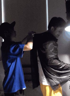 在摄影棚里,就能用上纯黑的背景布了,为了防止 “ 旋涡制造师” 的衣服反光到瓶子上,我们甚至给小鑫鑫换了套装扮。。。