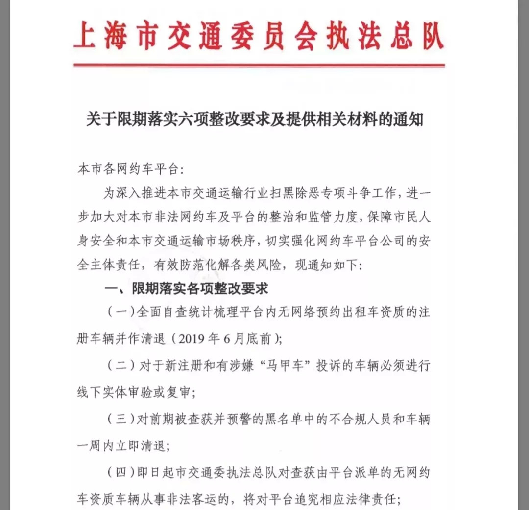 在之前,上海市交通委执法总队下发通知要求各网约车平台企业于6月底前完成清退平台内无网络预约出租车资质的注册车辆等工作。