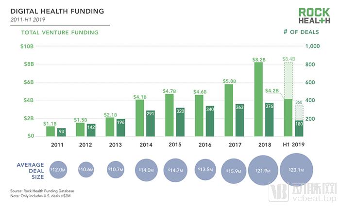 2011年至2019年上半年年度投资总额和交易量(图片源自Rock Health)