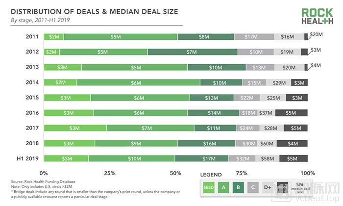2011年至2019年不同轮融资数额中位数(图片源自Rock Health)