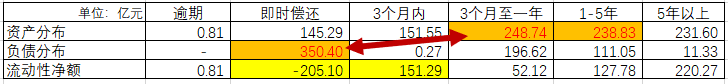 从实际来看,昆山农商行在6个月以内期限上存在利率风险缺口347亿元,这一数据非常接近上述的流动性风险缺口金额,间接确认了其期限错配的风险。