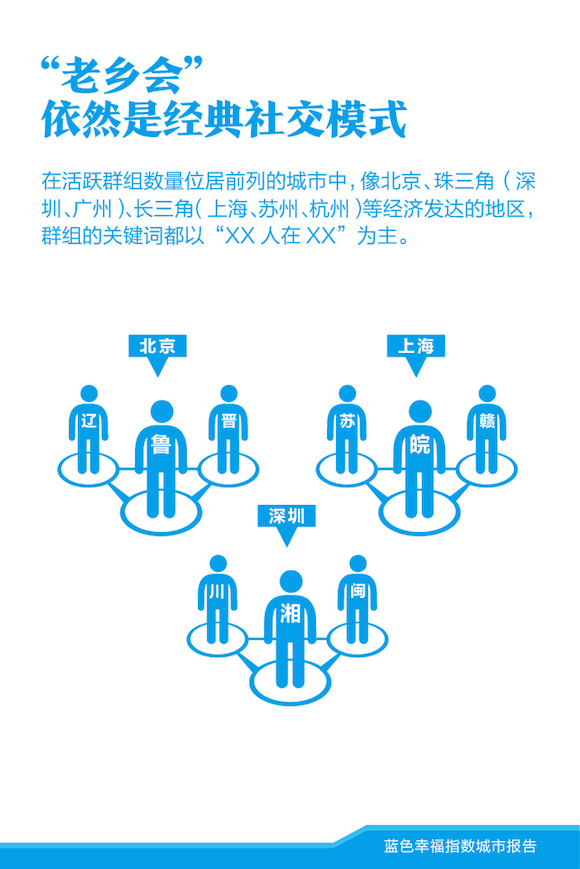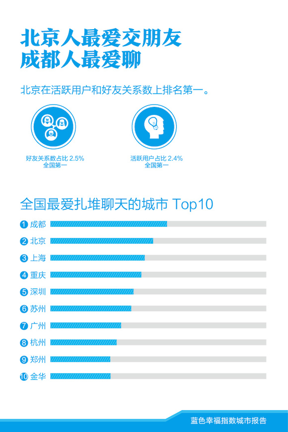对知识的好奇也和幸福指数成正相关。据知乎统计,北京、上海、广州、深圳、武汉是全国问答最活跃的5个城市,这些城市全部都在全国“蓝色幸福指数”排名前十。