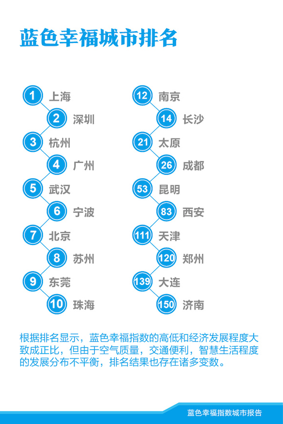 你生活在哪座城市,你关心哪座城市的“蓝色幸福指数”,看看大数据给我们提供的答案吧。