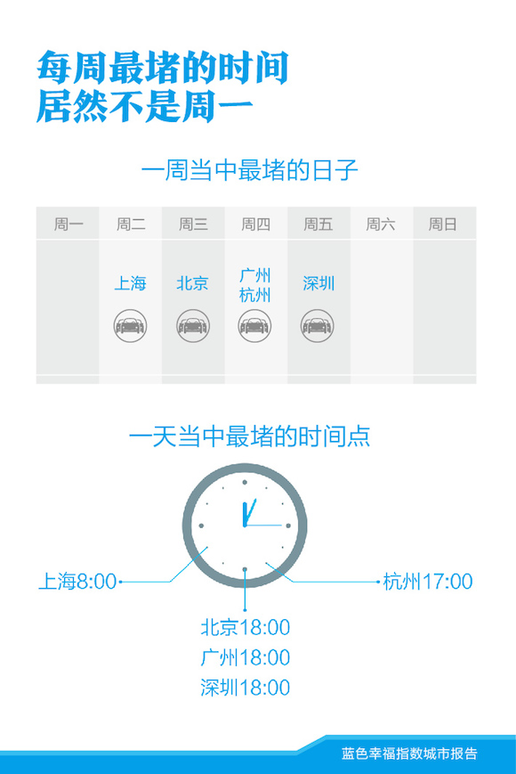 下面这个结论很有趣,可惜报告没有给出具体原因。一天之中上海是8点最堵,而杭州却是下班时刻17点最堵。大数据还否定了一件我们一直习以为常的事情。