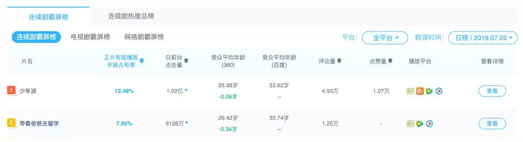 《少年派》从开播到结束,一路领跑同档电视剧,成功斩获“2019上半年省级卫视平均收视第一剧集”的宝座。