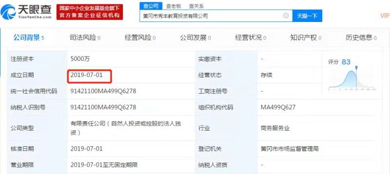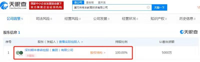 天眼查数据显示,7月1日,深圳顺丰泰森控股(集团)有限公司近日成立全资子公司——黄冈市秀丰教育投资有限公司。该公司注册资本5000万元人民币,法定代表人为张浩,经营范围为:对教育行业的投资、商务信息咨询、企业管理咨询、物业管理、房屋租赁、电子商务信息咨询。