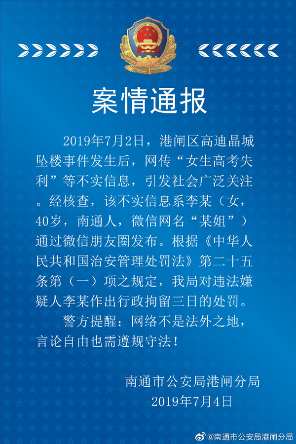7月4日,据江苏省南通市公安局港闸分局官方微博发布案情通报,7月2日南通港闸区高迪晶城坠楼事件发生后,网传“女生高考失利”等不实信息,引发社会广泛关注。经核查,该不实信息系李某(女,40岁,南通人,微信网名“某姐”)通过微信朋友圈发布。根据《中华人民共和国治安管理处罚法》 第二十五条第(一)项之规定,公安局对违法嫌疑人李某作出行政拘留三日的处罚。