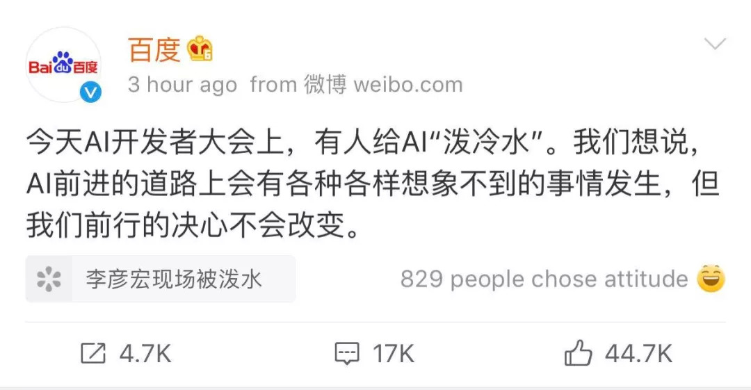 今天,Create 2019 百度 AI 开发者大会上,李彦宏被现场观众泼水,百度对此作出回应: