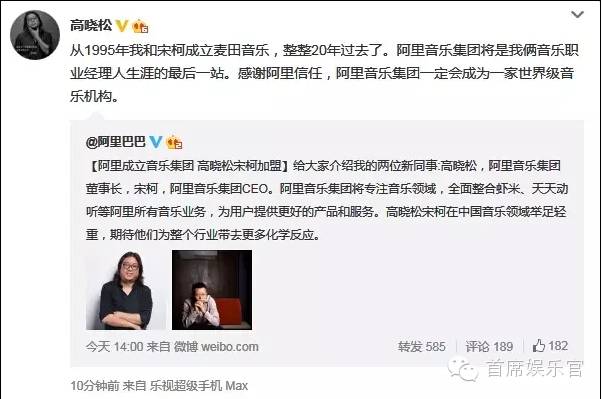 随即,高晓松转发该微博证实消息,并表示:“从1995年我和宋柯成立麦田音乐,整整20年过去了。阿里音乐集团将是我俩音乐职业经理人生涯的最后一站。感谢阿里信任,阿里音乐集团一定会成为一家世界级音乐机构。 ”