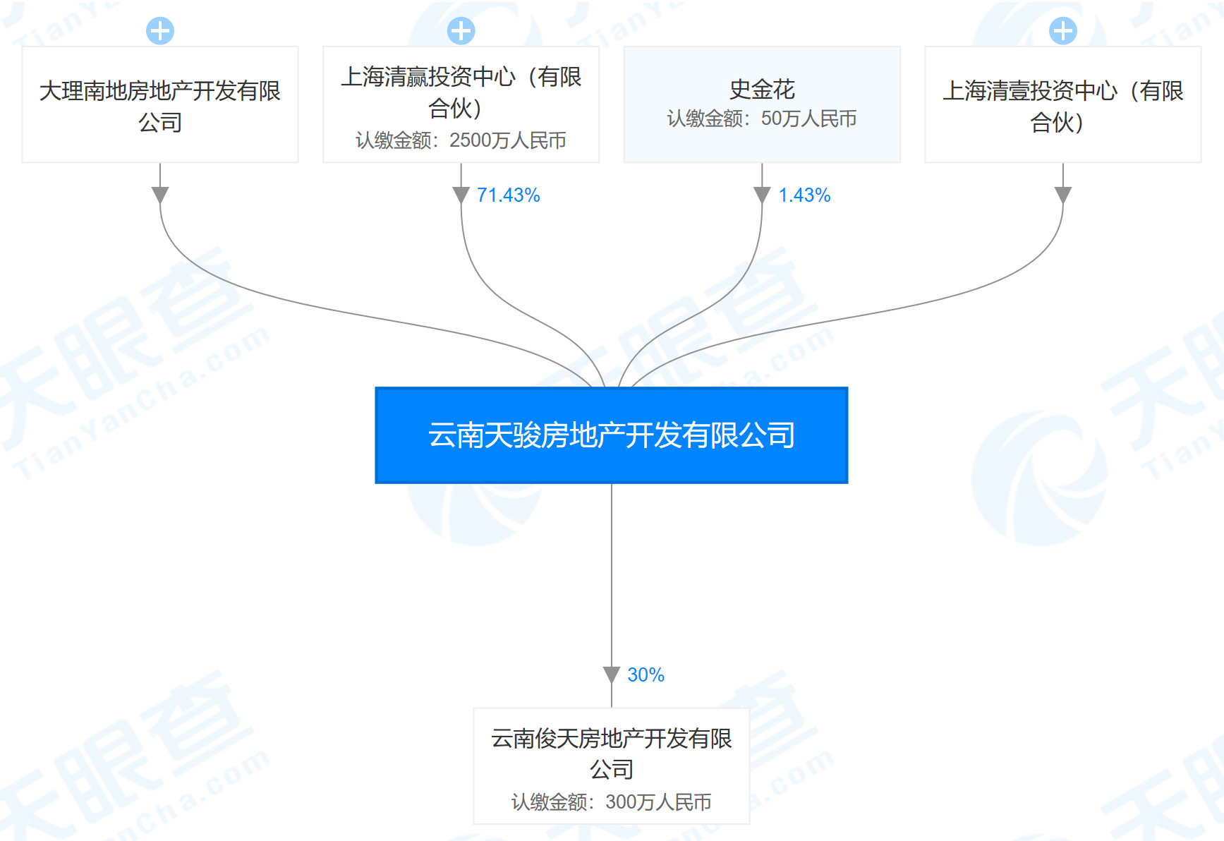 其中,出资最多的上海清赢投资中心(有限合伙),股东为大理南地房地产开发有限公司及昆明骏圣投资中心(有限合伙)。从股东构成来看,云南天骏房地产开发有限公司确实和龙湖集团没有任何关系,而是一家本地房企。
