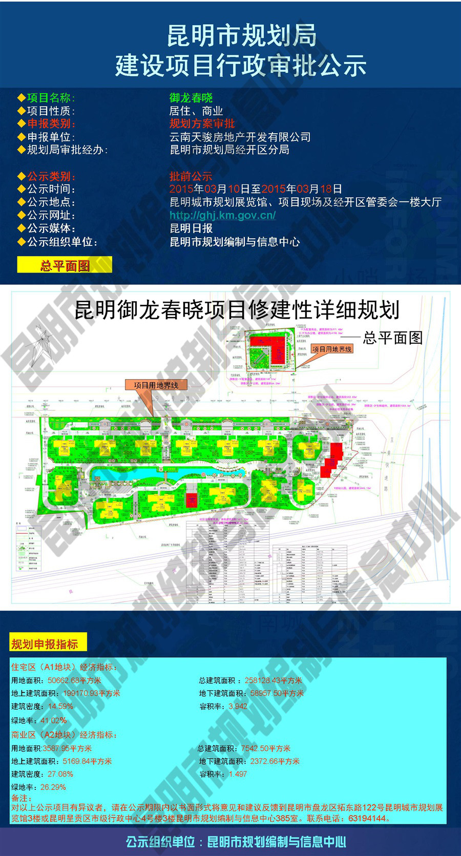 根据土地公告信息,这两宗地块位于昆明市经开区大洛羊街道办事处王家营,即云南交通职业技术学院(王家营校区)旧址。拿地之后的两年多时间里,项目都未有进展动态,直到2015年3月,昆明市规划局才公示了项目规划信息。根据规划方案,项目备案名为御龙春晓,位于昆明市经开区大冲片区。