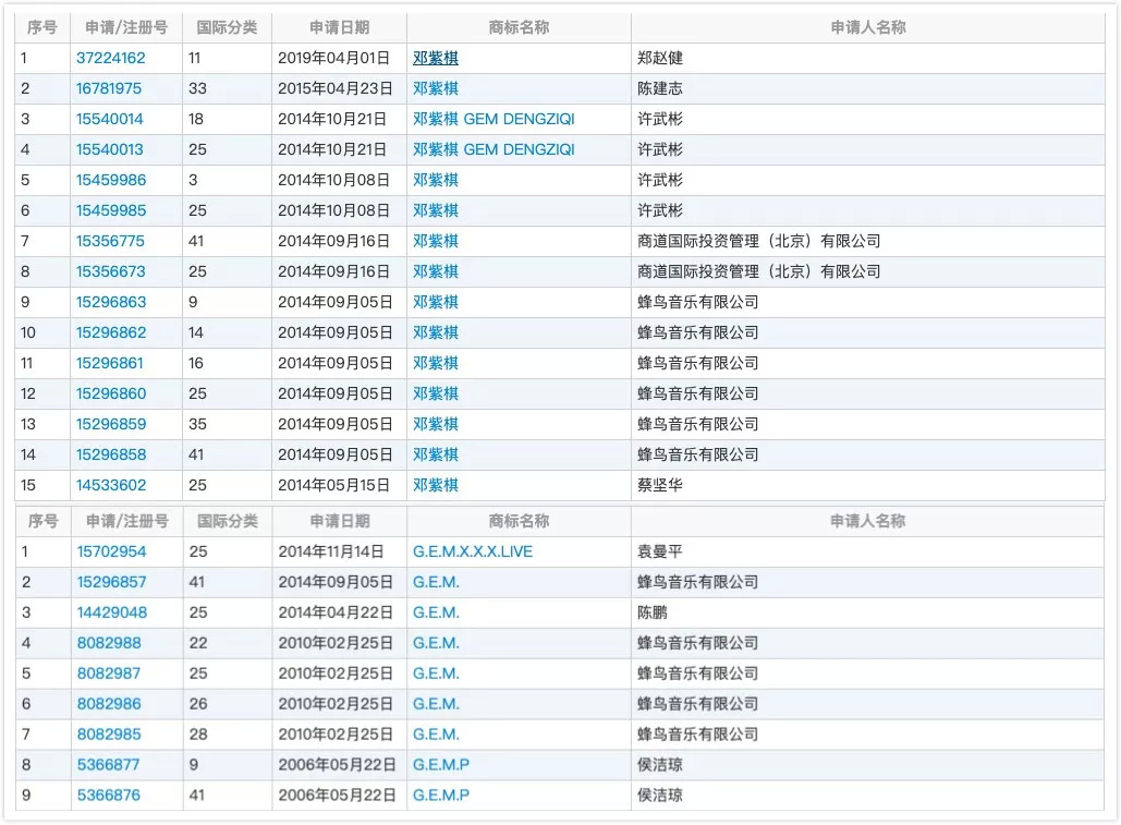 音乐财经从中国商标网网站信息了解到,“邓紫棋”和其英文名“G.E.M.”目前已被包括其经纪公司等企业注册了总共24项商标。而商标种类则包括健身器材、服装鞋帽、教育娱乐等。