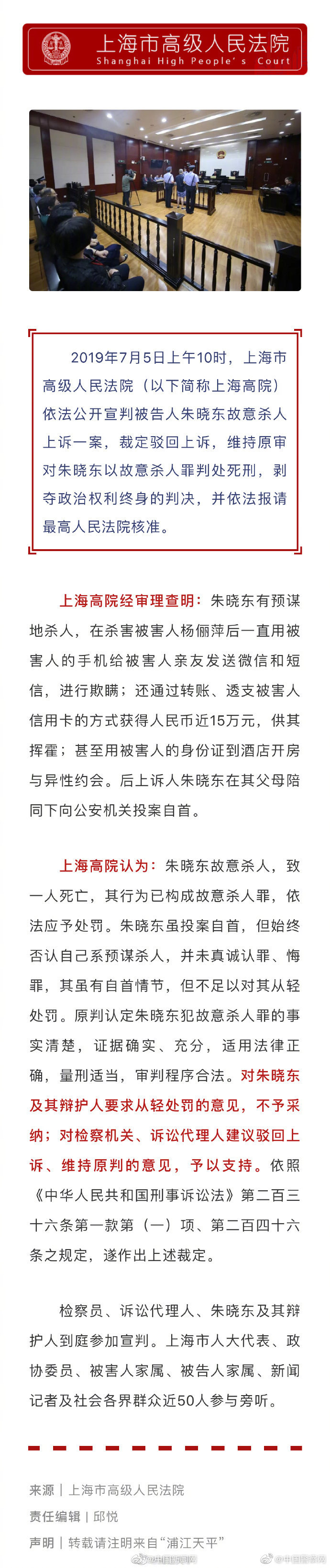 7月5日上午,上海市高级人民法院依法对被告人朱晓东故意杀人案进行了二审公开宣判,驳回被告人朱晓东上诉,维持一审判决,以被告人朱晓东犯故意杀人罪判处死刑,剥夺政治权利终身。