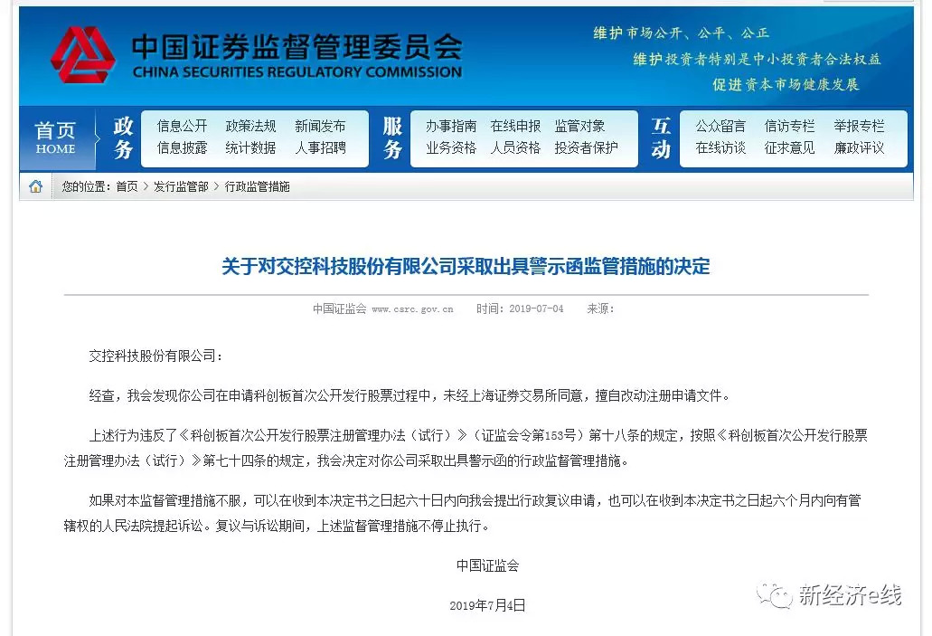不过,新经济e线注意到,在当天凌晨拿到发行批文的3家公司当中,交控科技在7月4日刚领到了证监会出具的首张科创板罚单。