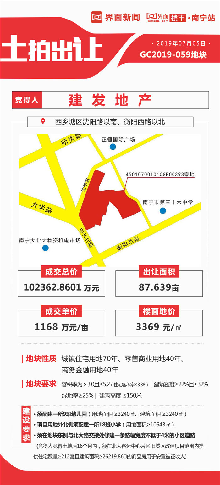资料显示,该地块宗地号为450107001010GB00393,出让面积为58426.29㎡(折合87.639亩)。建发房产以底价1168万元/亩,楼面地价3369元/㎡竞得该地块,成交总价102362.8601万元。