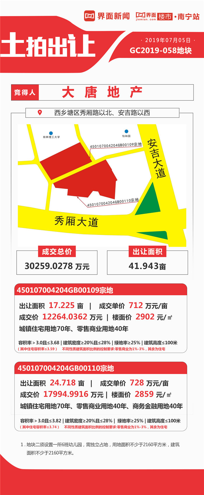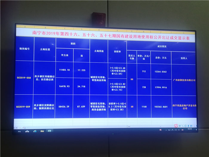 位于西乡塘区秀厢路以北、安吉路以西的GC2019-058地块旧改地,则由广西唐聚投资有限公司(大唐地产)以总价30259.0278万元竞得。