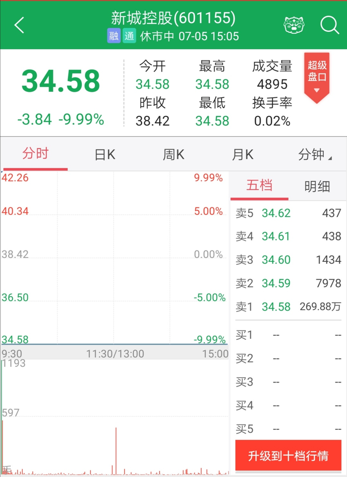 7月5日,A股方面,新城控股毫无疑问的再度开盘跌停,报34.58元/股。截至下午收盘,其跌停板封单近270万手,封板资金达百亿元,而今天整天,新城控股成交量还不到五千手,照此情形推算,已经两个跌停的新城控股或将在下周迎来更多的跌停板。