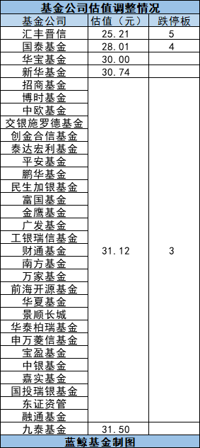 再从估值价格来看,大多数基金公司对新城控股的估值价为31.12元,相比于7月3日42.69元的收盘价有3个跌停,给出这一估值的有27家。