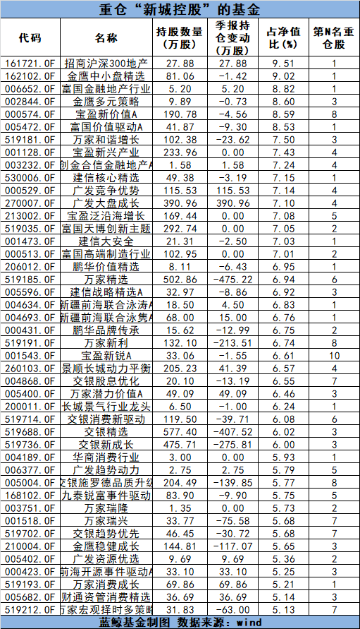 作为昔日的“中国房地产十强”,新城控股一直是众多机构投资者,特别是公募基金的重仓股。据wind数据统计,截至一季度末,共有132只基金重仓新城控股,其中44只基金持有新城控股占基金净值比超过了5%,招商沪深300地产、金鹰中小盘精选、富国金融地产等6只基金的仓位超过了8%,将会在此次事件中受冲击更大。