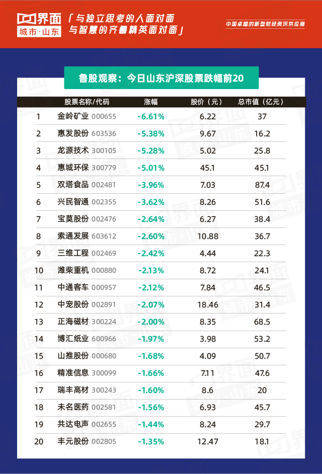 2. 跌幅榜首:金岭矿业(000655)涨幅-6.61%,收于每股6.22元;
