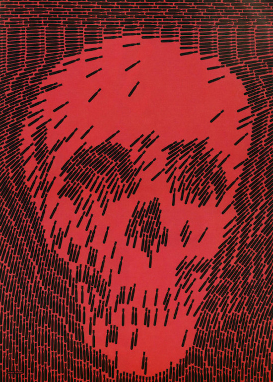他的另一张知名反战海报是这张出自1968年的作品:无数子弹落向一个骷髅头骨,红色和黑色烘托出一种恐怖和极度压抑的气氛。