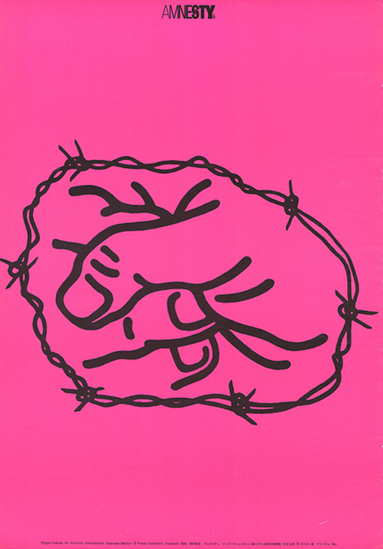 尽管他也有为数不少的商业合作伙伴,但福田繁雄总是对社会和文化问题表现出极大的关注和深深的忧虑。“他以对战争尖刻的讽刺和极力主张环保著称,”纽约时报设计记者Steven Heller如是写道。他为国际特赦组织设计的这张海报看起来触目惊心:一只紧握的拳头被带刺的铁丝网团团围住。