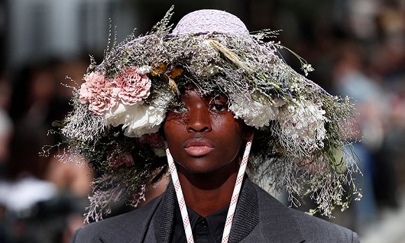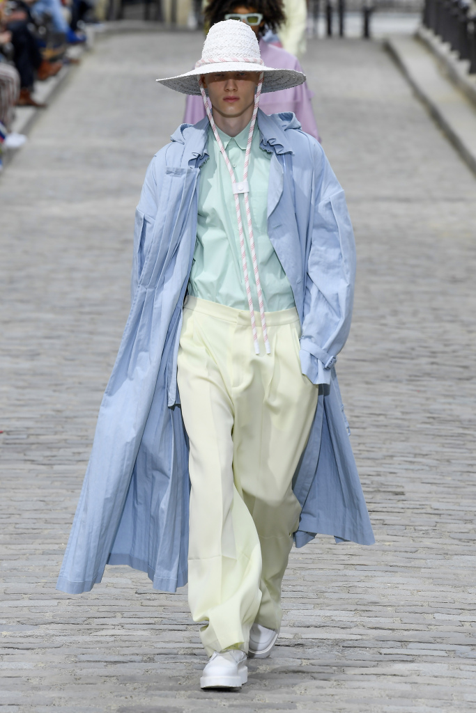 在刚过去的2020春季巴黎男装周上,Louis Vuittton男装秀上出现的一顶鲜花巴拿帽令人心旷神怡。这顶巴拿马帽装饰着粉色玫瑰、白色芍药、满天星和其他小野花,两根印着LV印花的细管连着帽子缓缓下垂,挂在模特的脖子上。本季男装周上,在帽子上下功夫的可不止Louis Vuittton一家。