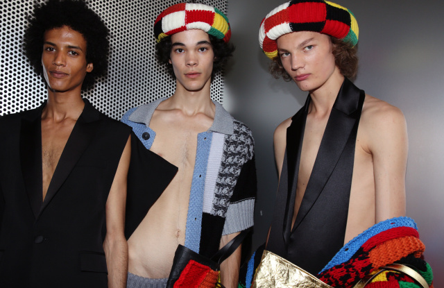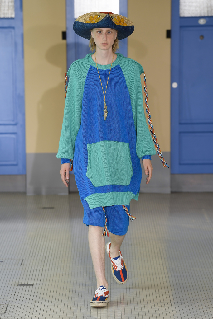 Jonathan Anderson在这季男装周尚献上了家居感十足的羊毛针织甜甜圈帽。这个系列的每顶帽子远看像个陶瓷艺品,左右对称,颜色不同。在这场大秀上,几乎所有的男模都头戴这顶甜甜圈帽出场,充满欢乐。该品牌设计师在这场大秀上想要一些“看似已经被传递下来,但是在‘错误’当中又蕴含着现代感的东西”。