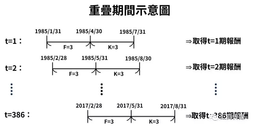 例如当形成期为 3 个月、持有期为 3 个月,(为了方便符号以(F,K)=(3,3)表示),代表以过去 3 个月的资料来衡量标的池中所有货币的表现。并在头寸建立后持有 3 个月再平仓。此方法会在每一期进行决策时,重复以过去 3 个月的报酬率表现建立新头寸,并在持有 3 个月后平仓。