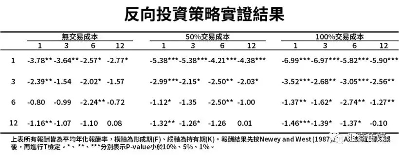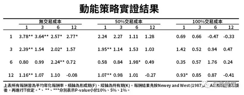 而由左至右观察表格能发现,交易成本对于实际交易造成很大的影响。在 50%交易成本时,仅有(1,3)、(1,12)、(6,6) 3 组显著为正,显见交易成本的影响力。