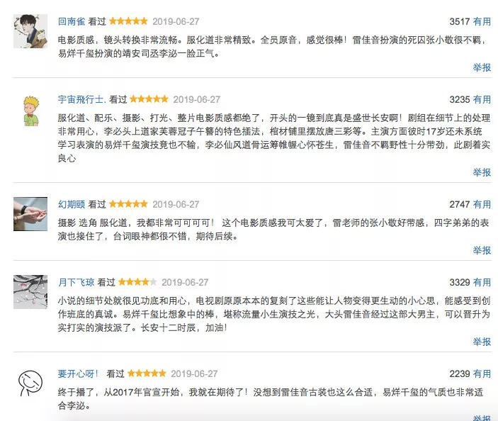 在豆瓣上,有7万人为《长安十二时辰》打分,好评率81%,打5星满分的占到50.1%,并且每条五星评价都获得了几千人的点赞认同,而这种满屏五星的阵仗已经很久都与国产剧无关了!