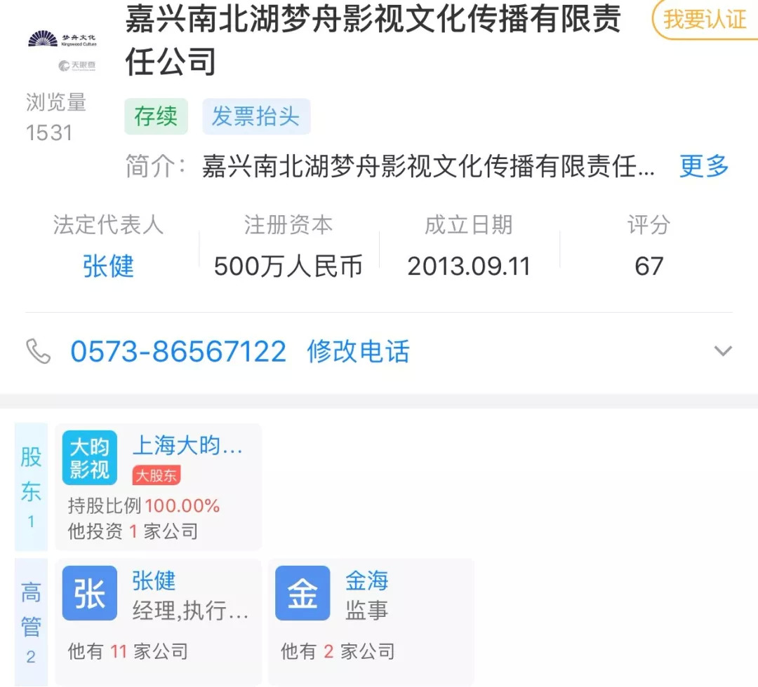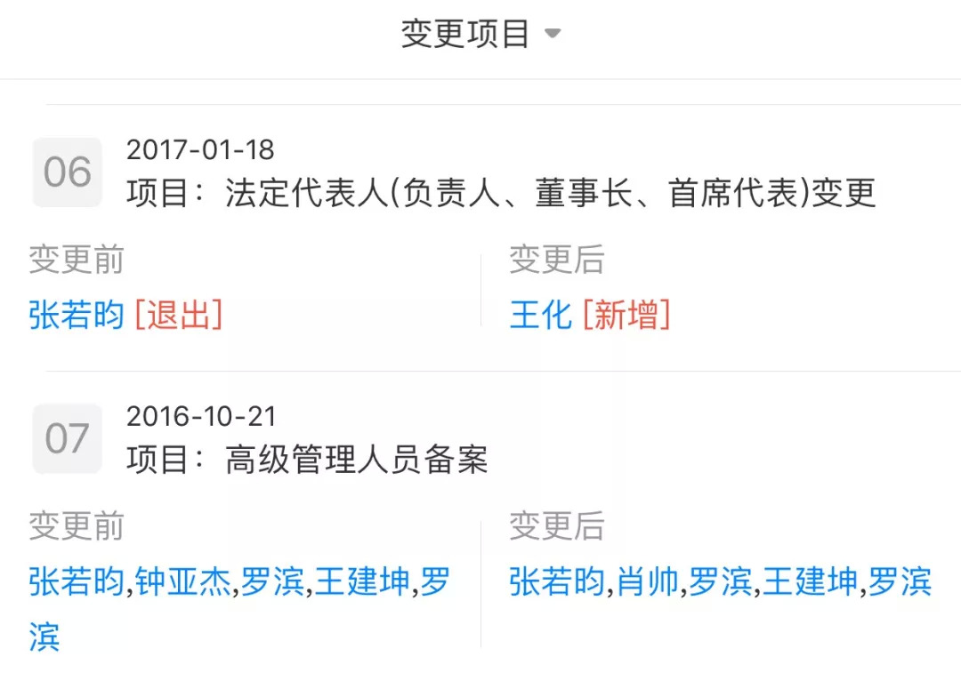 根据天眼查上南北湖梦都影业的企业变更信息来看,张健本为该公司董事长及法定代表人,2015年12月,张健退出高管层,董事长和法定代表人由张若昀接任。2017年1月,张若昀又退出了高管层,董事长和法定代表人变更为了王化。