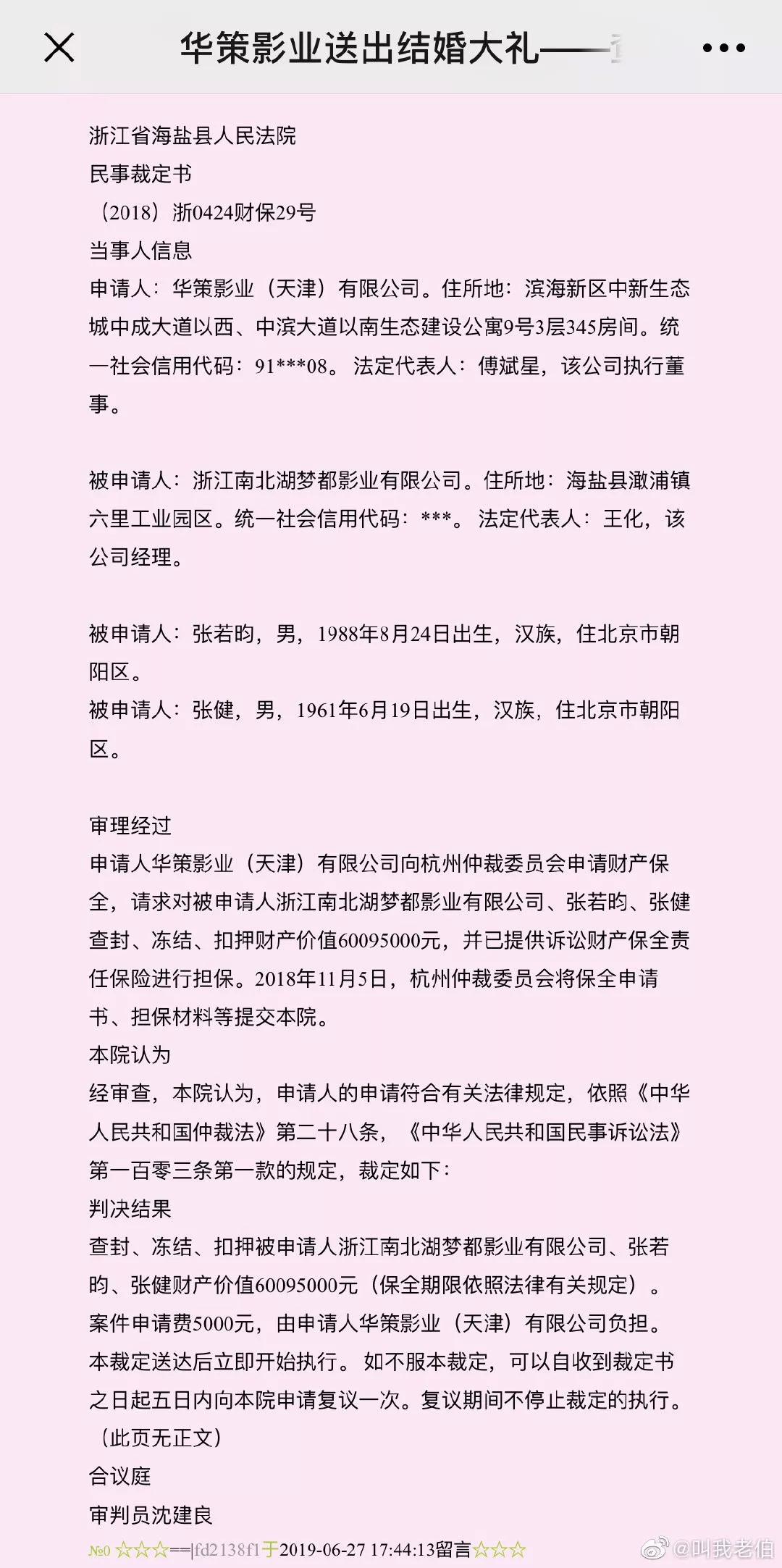 2018年4月,华策影视向杭州仲裁委员会申请财产保全,请求冻结被申请人浙江南北湖梦都影业有限公司、张若昀、张健价值6009.5万元的资产,2018年11月,浙江省海盐县人民法院给出了裁定书,实施了申请方的财产冻结要求。就在张若昀婚礼当天,这份裁定书被人爆出。