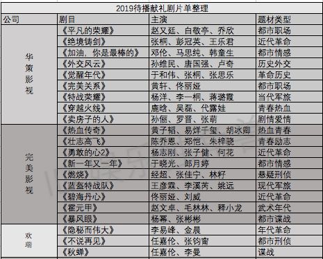 其他影视公司,诸如欢瑞世纪、耀客传媒、华谊、和力辰光以及爱优腾芒也都加紧了献礼剧脚步。欢瑞世纪以《隐秘而伟大》《不说再见》《秋蝉》三部待播剧,牢牢霸占观众眼球;华谊、和力辰光、耀客传媒等新入局公司,也都至少人手一部。