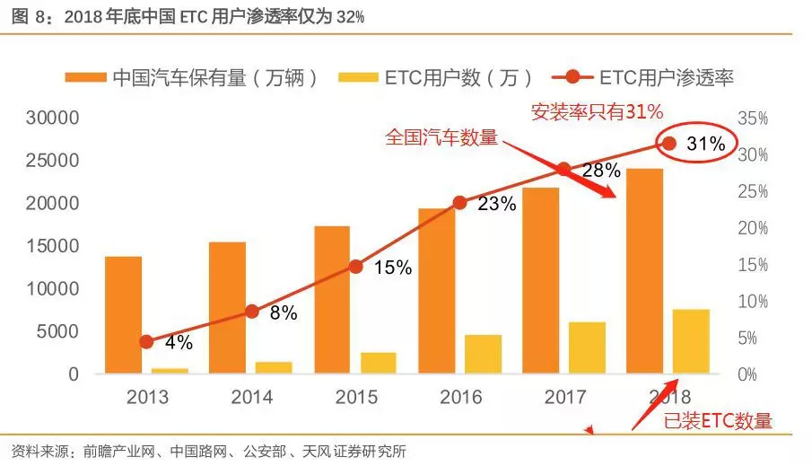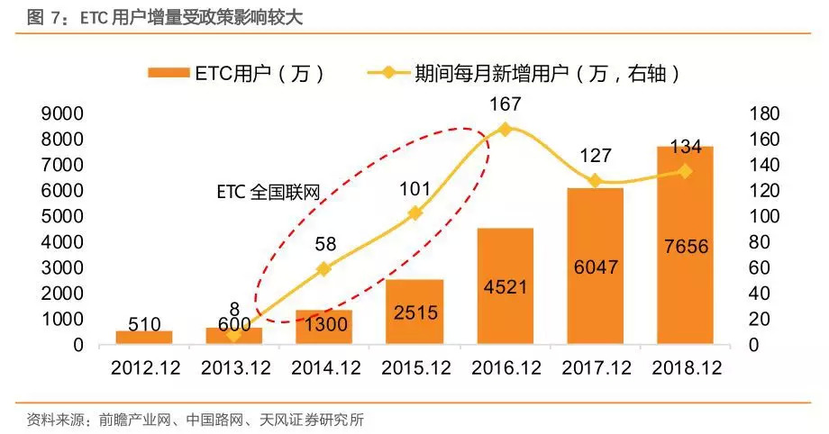 天风证券测算,目前全国汽车保有量突破2.46亿辆,全国汽车保有量与已装ETC数量的对比,当前ETC安装率仅31%;ETC用户增量受政策影响较大。