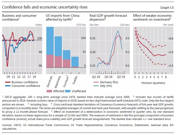 过去一年,企业和消费者信心从周期性高点稳步回落 (图I.5,第一面板)。持续的贸易紧张,特别是中美之间的贸易摩擦,抑制了商业景气程度,部分原因是担心可能提高的关税 (第二面板)。除了给未来的需求和固定资产投资前景蒙上阴影外,贸易紧张还引发了对现有供应链结构可行性的质疑,更一般地说,是对全球贸易体系未来的质疑。