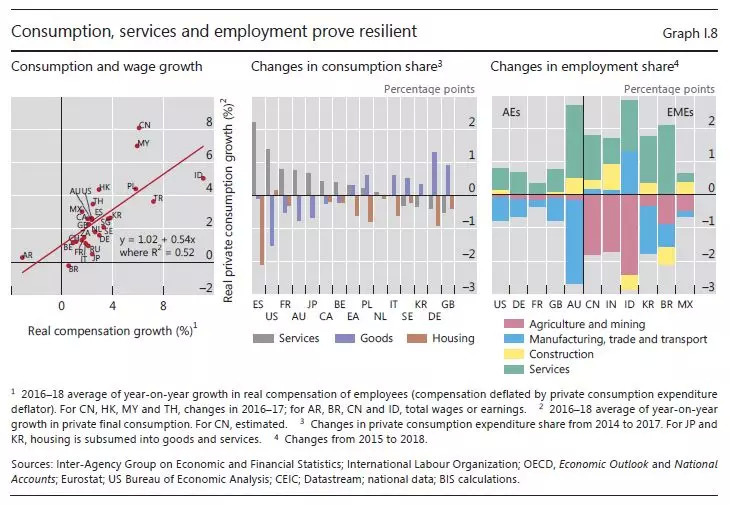 即使贸易和制造业活动放缓,在就业和工资持续增长的支撑下,全球消费仍然相对强劲 (图I.8,左侧面板)。消费的韧性也可以部分解释为何服务业的表现优于制造业。但结构性因素可能也起到了一定作用:消费的构成总体上已向服务业转移,尽管各国的情况不尽相同 (中间面板)。