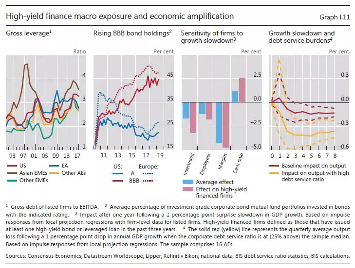 金融环境趋紧可能抑制投资,加剧经济放缓。在那些企业杠杆率更高、在投资中作用更大、更容易受到商业地产价格 (以及由此带来的抵押品价值) 下跌影响、并大量借入外币的公司,这种影响往往会更大。计量经济学证据表明,在经济放缓之后,高收益债券融资公司的投资下降幅度是其他公司的两倍 (图I.11,第三面板)。在美国,2015年17月,高达40%的资本支出发生在高收益债券融资公司。在公司债务相对较高的经济体中,法国、瑞典和美国的商业地产价格在过去一年里有所下降 (图I.10,中间面板)。经过多年在国际市场上的强劲发行,截至2019年3月底,非金融企业发行的以外币计价的债券余额达到4万亿美元,其中约8500亿美元将在未来两年内到期。
