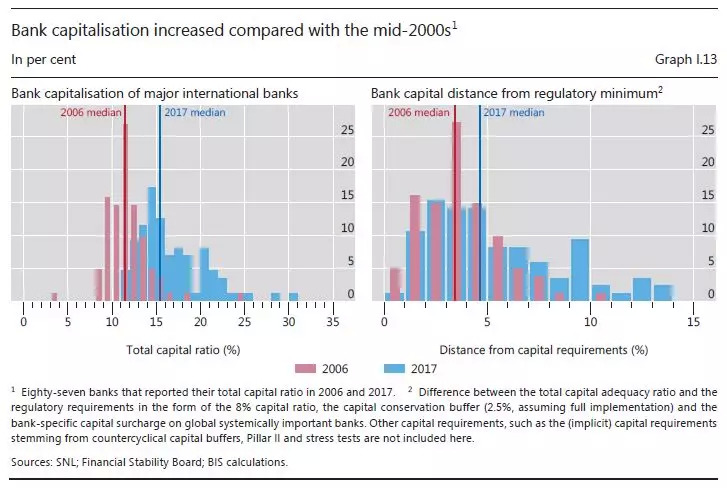 银行支持经济的能力,尤其是在经济低迷时期,取决于它们的资本状况和盈利能力。由于巴塞尔协议III的改革,银行资本金大幅增加 (图I.13,左侧面板)。正如大量实证所表明的那样,更强大的资本金基础不仅能提高银行的稳定性,还能支持更多的贷款。此外,由于资本金远远高于监管要求,银行也不太可能缩减放贷以避免违反资本金要求。据估计,资本缓冲从2000年代中期开始显著增加 (右侧面板)。就大型银行的中位数而言,2006-17年间,资本缓冲从3个百分点左右升至5个百分点 (竖线)。