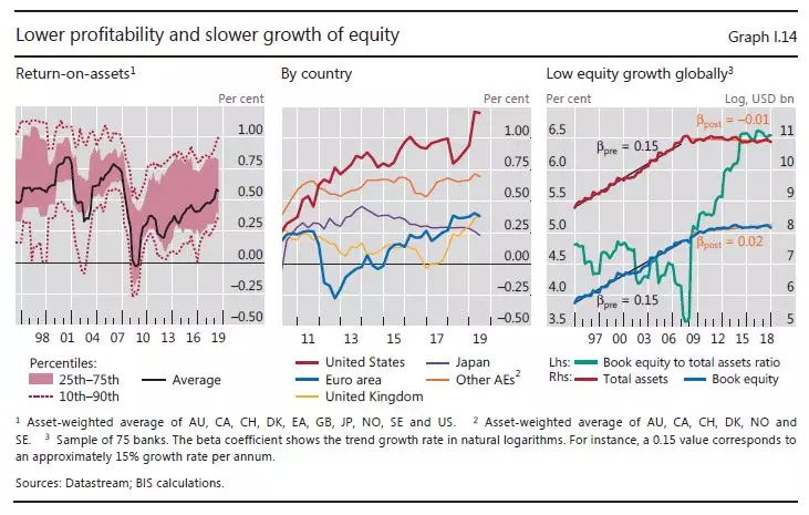 不幸的是,银行的盈利能力一直乏善可陈。事实上,以资产收益率为例,许多发达经济体的银行平均盈利能力远低于本世纪初 (图I.14,左侧面板)。在这一群组中,美国银行的表现远远好于欧元区、英国和日本的银行 (中间面板)。