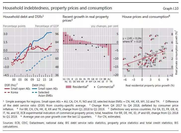 高企的家庭债务和疲弱甚至负增长的房价,可能已经开始对这些国家的私人消费构成压力。例如,在发达小型开放经济体中,房价开始下跌,私人消费增长在2018年平均放缓了约0.5个百分点,其中加拿大和瑞典已超过了1个百分点。这与近年来的经验相一致,即在发达国家和EME的广泛样本中,私人消费增长与住宅价格之间存在相对密切的相关性 (图I.10,右侧面板)。