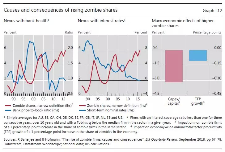 公司债务的持续增加也对经济的总生产潜力产生影响。那些在较长时期内无法通过营业利润支付偿债成本、增长前景黯淡的公司,即所谓的“僵尸企业”,其杠杆率平均比盈利的同行高出40%。自20世纪80年代以来,随着银行健康状况的恶化 (图I.12,左侧面板,P/B下滑),以及利率的下降 (中间面板),僵尸企业所占份额有所上升。目前,僵尸企业约占非金融类上市公司的6%,占其资本存量的2.5%。它们不仅降低了自身的生产效率,而且挤占了生产效率更高的公司所能获得的资源,从而削弱了整个经济的生产率增长。有证据表明,随着时间的推移,它们的增长将对宏观经济产生了重大影响 (右侧面板)。